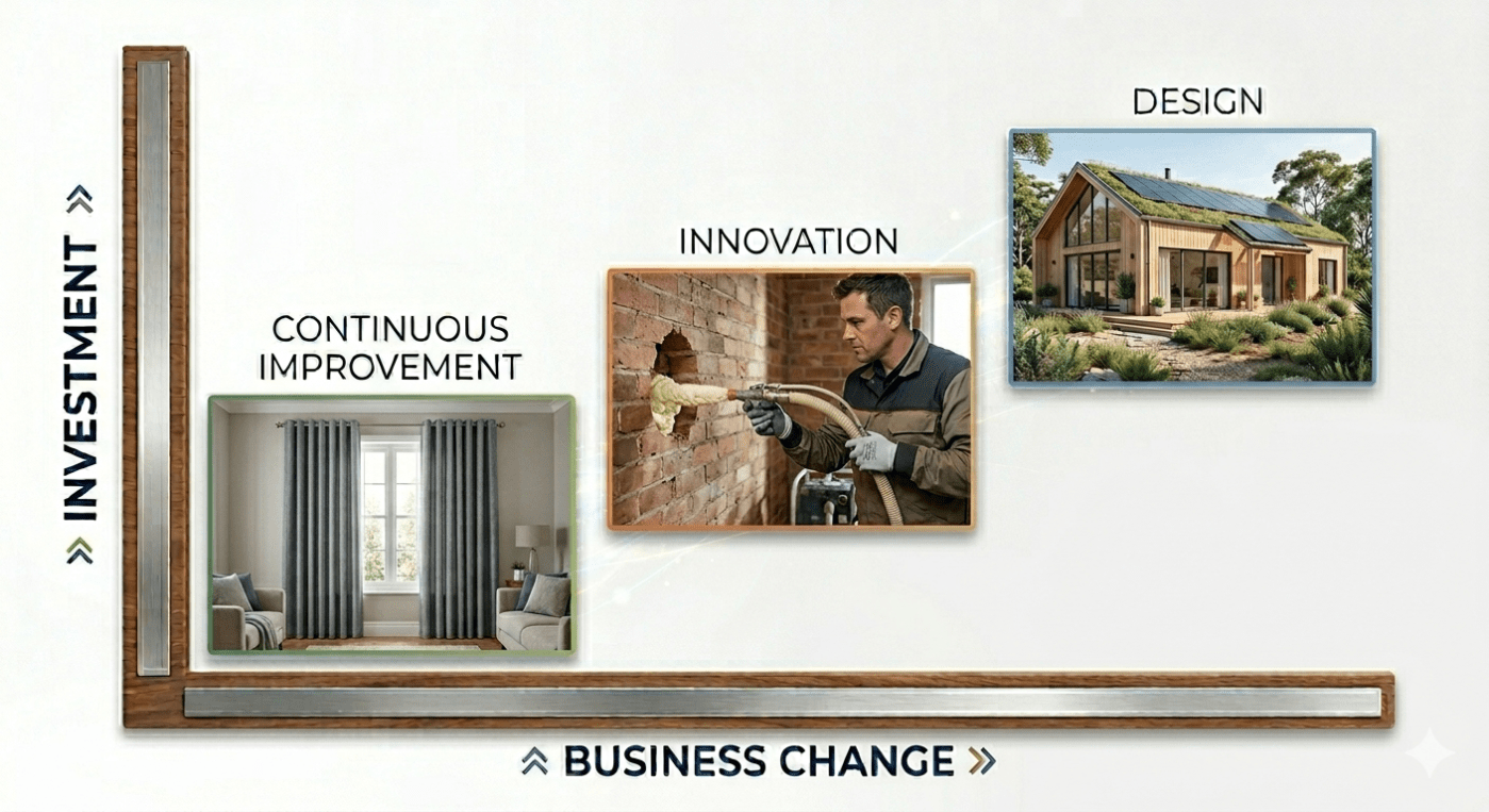 There’s an analogy I like to use that has the example of household insulation. Unless you live in a very hot country, keeping your home warm through the seasons, especially the colder ones, is something you’ll be familiar with. It neatly illustrates how corporate innovation sits between continuous improvement and design, as follows: